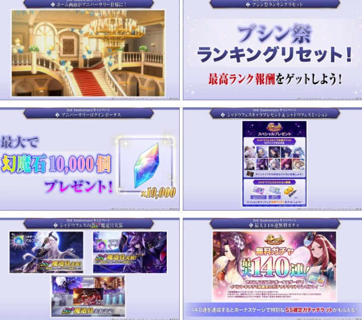面向即将在 11 月 29 日迎来日版发行3周年,游戏内预定实施一系列庆祝活动,包括画面期间内变更为3周年特别版本、武心祭排名重製、登入奖励最多幻魔石 10000 颗、闇影庆典角色赠送活动&闇影庆典任务、追加 SS+ 魔道具、最多免费 140 抽(完成条件获取特别 SS 确定转蛋券抽取分色卡池活动角色转蛋)、开设週年硬币商店、强化应援 6 大活动 以及贩售各种优惠礼包。
