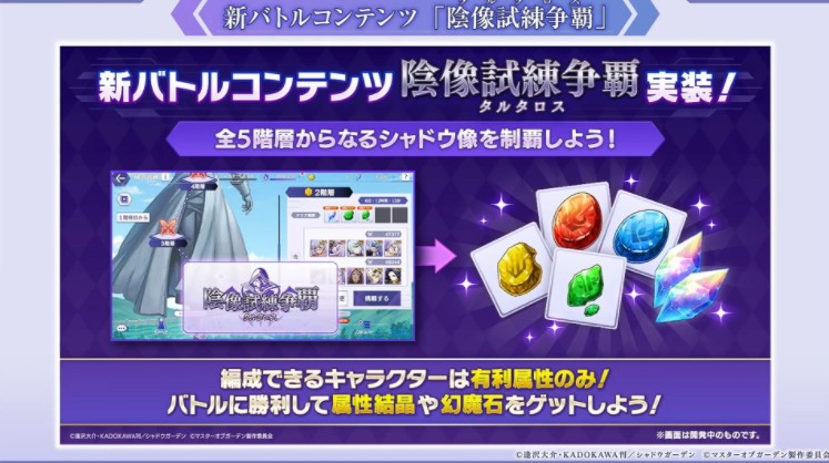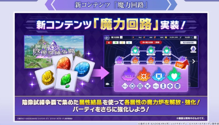 作为发行 3 週年大型更新方面,追加全新战斗内容「阴像试练争霸」,编成两队伍进行挑战获得「属性结晶」与「幻魔石」,并透过在阴像试练争覇获得的「属性结晶」来解放.强化各属性的魔力炉藉此强化队。