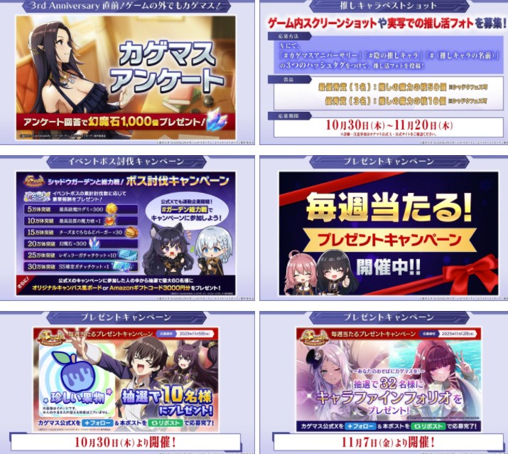 游戏外同样实施日版发行3周年活动,包含期间内回答问券可获得幻魔石 1000 个、推角最佳照片徵文活动、全玩家累积讨伐活动 BOSS 活动、每週奖品抽选活动(珍贵的蔬菜.角色收藏画组.贺年卡.荞麦麵.高级床/原创寝具组)、第二回角色人气投票并为第 1 名新绘插图&製作壁纸(追加投票角色&闇影入殿堂故不在投票名单)、角色理解检定考试并全答对可聆听特别语音、希妲 2025 生日投稿活动。