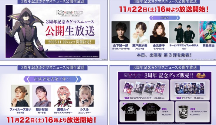 此外,预定在 11 月 22 日(六)台湾时间下午 3 点将实施《我想成为影之强者!Master of Garden》发行3周年纪念首次公开直播日,同时也预定贩售发行3周年纪念商品。