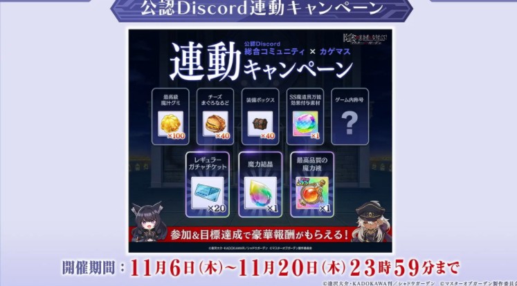 于 11 月份官方 Discord 连动活动,期间内 11 月 6 日至 11 月 20 日参与并达成目标即可获得豪华报酬奖励,分别为 魔力结晶、精选转蛋抽卡券、装备箱、最高级魔汁、汉堡 以及 游戏内称号,并额外实施实体週边抽选。