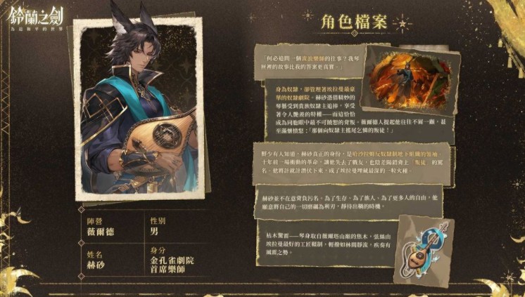 于 10 月 17 日初登场的「赫砂」,表面是埃拉曼奴隶剧院的首席乐师,凭精妙琴艺享受特权,却因此被同胞视为「向奴隶主摇尾乞怜的叛徒」。