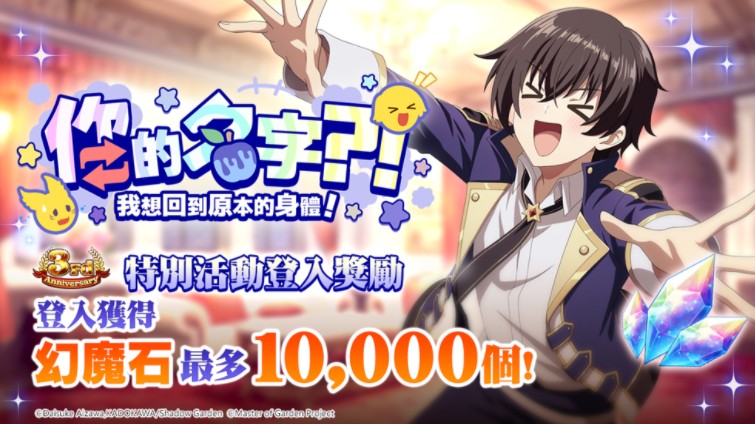 10 月 30 日(四)更新后,「你的名字?!我想回到我原本的身体!」举办特别登入活动,活动期间中每天登入即可获得最多 10,000 个幻魔石,请记得每天登入!