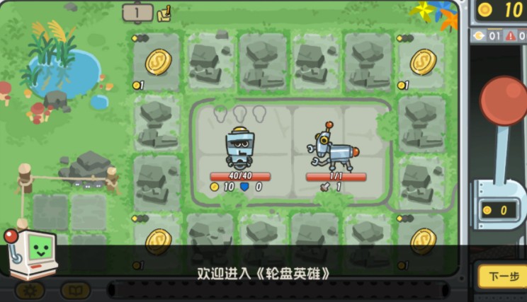 和《小丑牌》一样,《轮盘英雄》基本上没有任何的剧情,就是纯纯的战斗爽,刚一打开游戏就会蹦出来一个机器人,教你怎么去拉动屏幕右侧的拉杆进行旋转。