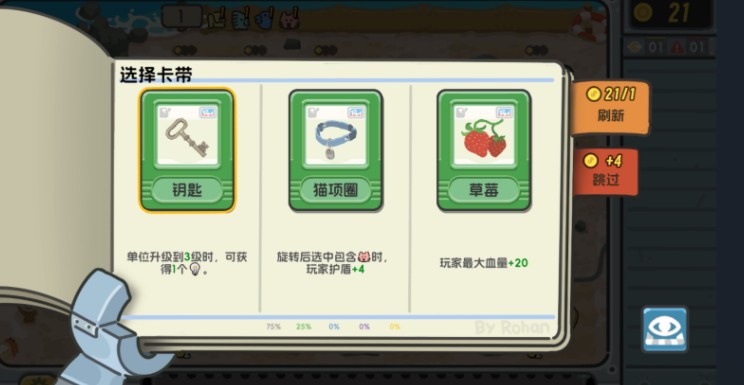 有的一些卡带抓到了就可以作为你的底层逻辑来使用,甚至可以围绕着这个卡带来构建轮盘,而有的卡带只能给你提供一些容错率,比如提升这个草莓就和杀戮尖塔一样,提升最大血量防止被一击瞬秒。