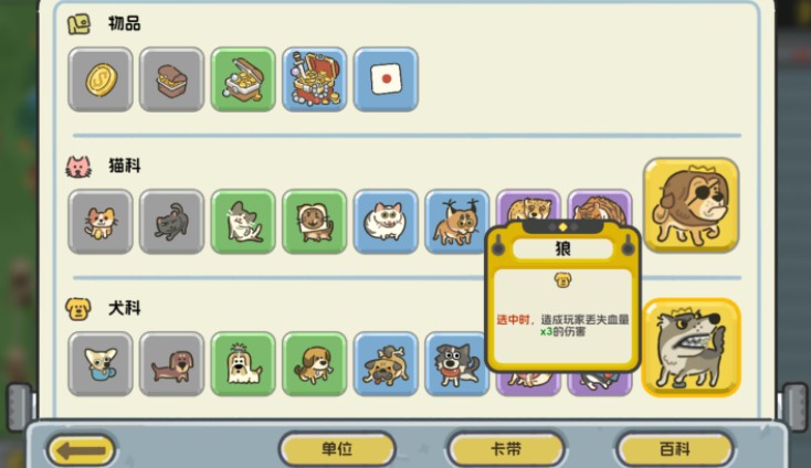 每一个动物朋友都有自己的流派,动物是有13个种族之分的,比如物品(非动物)、猫科、犬科、鸟、幻想、有蹄、鱼、机械等等,只要选到了动物,它们就会帮助你对敌人进行攻击。