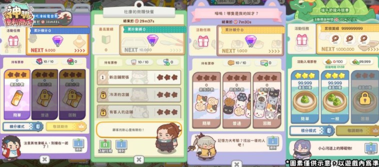 玩家可依活动主题挑战不同玩法:【哪吒滑板电音秀】化身节奏竞速游戏,收集能量饮料即可累积分数、争取限定神明「哪吒」;【杜康的微醺快餐】则考验手速与反应,完成送餐订单累积业绩解锁神明「杜康」;在【喵呜!哪隻是我的奴才?】中翻牌找出猫咪配对卡,蒐集积分迎回神明「太阳星君」;最后则是【划船不划水挑战!】龙舟竞速玩法,完成任务即有机会获得神明角色「何仙姑」。多款活动交替登场、奖励丰富,相信玩家们的经营日常将收穫不间断的趣味、增添无限挑战!