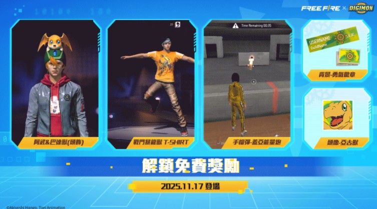 从 11 月 17 日至 30 日,《Free Fire》玩家可以透过游戏内合作限定庆祝活动,沉浸在备受喜爱的《数码宝贝大冒险》宇宙裡。在探索过程中,玩家会发现数码蛋,并与亚古兽和天女兽主题的投币机互动,重新唤起对这部深植人心的《数码宝贝大冒险》系列的美好回忆。