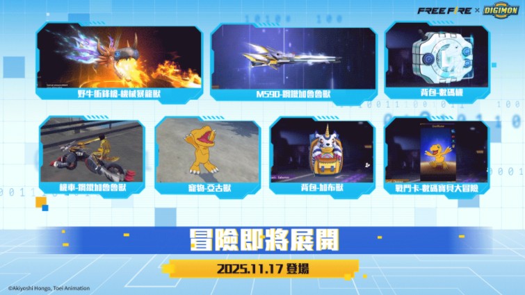 Garena 宣布《Garena Free Fire》与传奇动漫IP《数码宝贝大冒险》展开合作,于 11 月 17 日将数码宝贝系列的首部电视动画《数码宝贝大冒险》带进《Garena Free Fire》。粉丝和玩家将可以解锁游戏内造型,包含阿武 & 巴达兽头饰、手榴弹 - 盖亚能量炮、野牛衝锋枪 - 机械暴龙兽、亚古兽宠物等等。