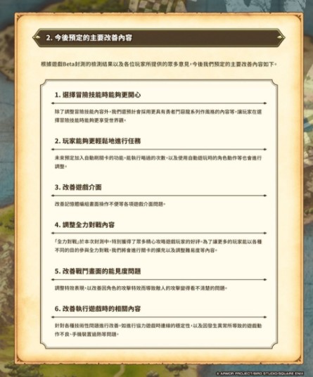 预计改进方向包括:导入「勇者斗恶龙」系列的特色要素,让冒险技能的选择过程更具趣味性;新增自动重複挑战功能,并调整可跳过的次数与自动游玩时的角色行动设定,让玩家在重玩任务时能享有更流畅、轻鬆的体验。