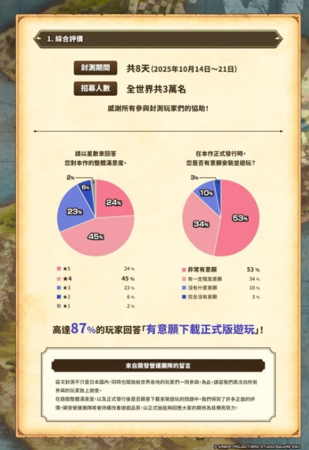 本次公开的报告收录了 2025 年 10 月 14 日(二)至 10 月 21 日(二)期间举办的 Beta 封测结果,内容包含玩家问卷的统计分析,以及开发与营运团队针对各项意见回馈的回应。官方表示,未来也将持续依据玩家的意见与建议进行最佳化,期望能在正式上市时为玩家带来更完善的游戏体验。