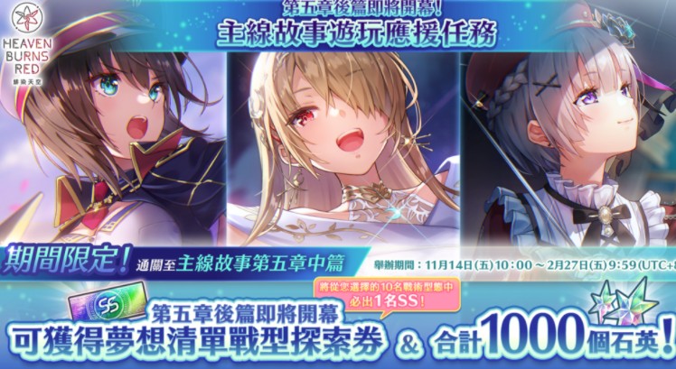 期间中通关至第五章中篇,就能获得可自行选择 10 种出现的 SS 战术型态来进行探索的「第五章后篇即将开幕梦想清单战型探索券」和合计 1000 个石英!