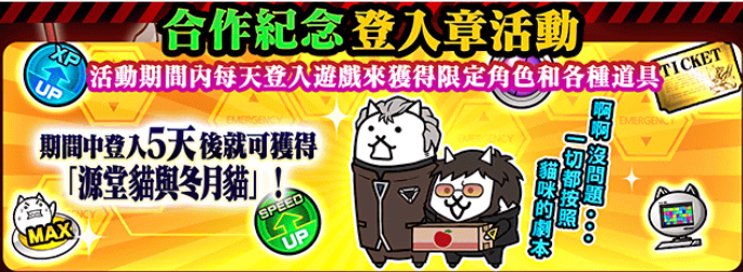 活动期间内,每天登入游戏都可以获得 1 个签到章。登入满 5 天就可以获得合作限定 EX 角色「源堂猫与冬月猫」,记得天天来登入游戏!