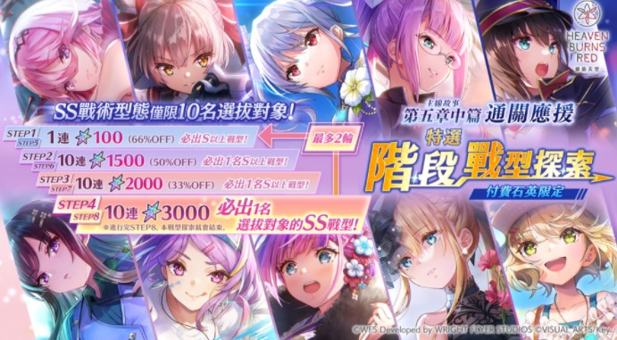 「主线故事第五章中篇通关应援 特选阶段战型探索」为付费石英限定的探索,在 STEP4 和 STEP8 的第 10 次必出 SS 战术型态!