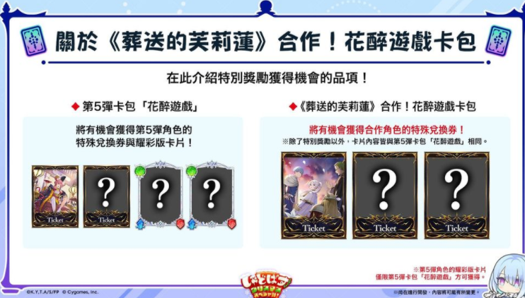 第 5 弹卡包登场后,游戏内将开始贩卖「《葬送的芙莉莲》合作纪念!附赠购买特典组合包」。依据所购买的数量,玩家可获得芙莉莲合作的卡片风格等特典。