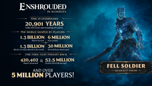 今日,Keen Games满怀激动(且带著一丝丝紧张)地告知各位:请期待2026年秋季《雾锁王国》正式版的发布。抢先体验开启后的爆发式成功,让团队有能力去执行并拓展《雾锁王国》最初的构想,而2026年下半年正是实现这一愿景的理想时机。1.0版本的发布并非终点,而是持续开发的全新篇章——后续还将有更多的优化、新增内容等。如果没有超过500万名玩家的支持,这段旅程绝无可能实现。开发团队再次向所有通过游戏、反馈和参与社区来添砖加瓦、添柴加火的火之子们致以诚挚的谢意。以下是收集到的一些令人惊叹的游戏数据:
