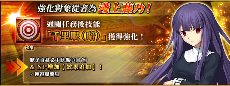 迦勒底之门中将常驻追加「★4(SR)浅上藤乃」、「★4(SR)灾星简」的特别任务「从者强化任务」,通关任务后不仅可以强化对象从者,更能获得圣晶石奖励。