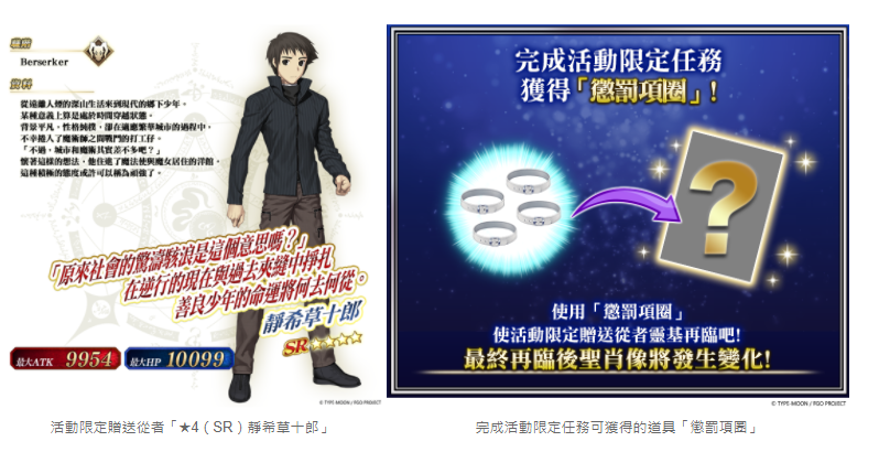 通关「活动主线任务第 1 节(后篇)进度 2」后,活动限定赠送从者「★4(SR)静希草十郎」将正式加入,且活动期间内强化时所获得的经验值,将提升为 2 倍。使用完成活动限定任务可获得的道具「惩罚项圈」,完成最终再临后,活动限定赠送从者「★4(SR)静希草十郎」圣肖像将发生变化。