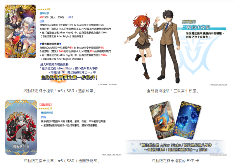通关活动任务,可蒐集到「古董提灯」、「温泉牛奶」及「有隐情的符纸」等活动道具,可兑换包含活动限定概念礼装「★5(SSR)温泉球争」,装备后自身的攻击威力将提升;能大幅强化概念礼装的 EXP 卡「★4(SR)奇趣双子」与「★3(R)多话的侦探罗宾」,以及「★4(SR)静希草十郎」的从者币等多项奖励。