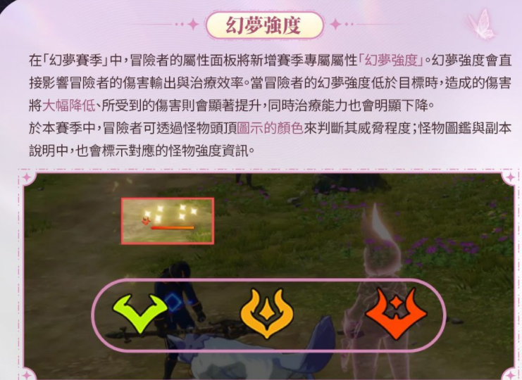 官方表示,本次「幻花异梦」赛季将新增专属属性「幻梦强度」至冒险者的属性面板中,并且会直接影响冒险者的伤害输出及治疗效率。若冒险者的「幻梦强度」低于敌人时,其攻略难度将大幅上升,反之若「幻梦强度」高于目标则大幅下降。