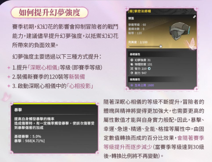 冒险者可透过培养「深眠心相仪」或是装备新赛季实装的 120 装等装备提升「幻梦强度」。增强实力、利用强度辗压所有敌人吧!