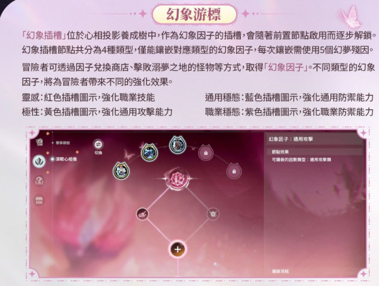 启用「心相投影」后将展开一条结构简洁、由多个节点组成的养成树。随著前置节点启用将会逐步解锁「幻象插槽」,插槽主要分为「灵感」、「极性」、「通用稳态」、「职业稳态」四种类型,冒险者可以消耗「幻梦残因」,把「幻象因子」镶嵌进对应类型的插槽中,为冒险者带来不同的强化效果。