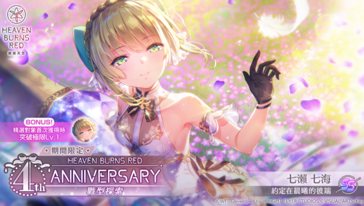 Wright Flyer Studios × Key 戏剧性 RPG《绯染天空 Heaven Burns Red》于 2026 年 2 月 1 日 (日) 晚上 21:00 起,开始 4th Anniversary 特别活动。举办最多 200 连免费的每天免费 10 连战型探索以及可选择 1 名喜欢的 SS 战术型态获得等豪华报酬的特别宾果任务。
