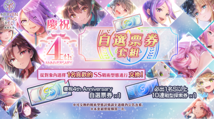 为了庆祝绯染天空 Heaven Burns Red 4th Anniversary,将实施「绯染天空 4th Anniversary 特别宾果任务」。达成所有任务即可获得庆祝「4 週年 必出 SS 自选战型探索券」和合计 1000 个石英等豪华道具。