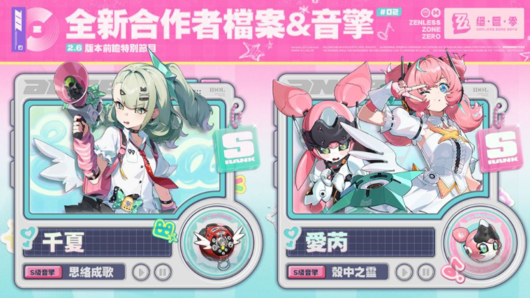 在幕后始终默默陪伴、支持她们的是后援会会长邦布阿饭,能持续回复代理人生命值,当队伍中至少有两位妄想天使成员时,还能提升全队攻击力。随著千夏与爱芮一同登场的还有可爱的全新时装,其中爱芮的时装更具备独特的双形态设计。此外,S 级代理人仪玄(玄墨,命破)和柚叶(物理,支援)也将在该版本回归。
