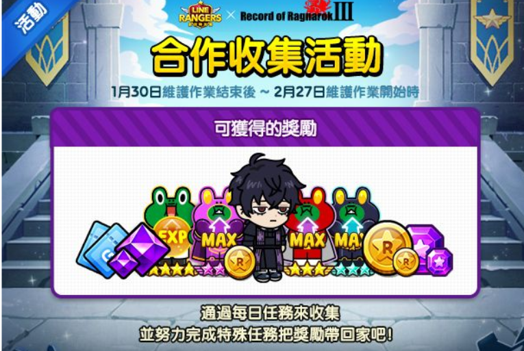 合作活动期间中,「黑帝斯」、「始皇帝」、「尼古拉特斯拉」、「阿波罗」、「别西卜」将作为合作限定 Rangers 登场之外,同时还有以《终末的女武神 Ⅲ》常见物品为造型的合作装备同步开跑!另外,只要在合作活动期间,登入《LINE Rangers 银河特攻队》就可获得限定合作 Ranger「别西卜」。