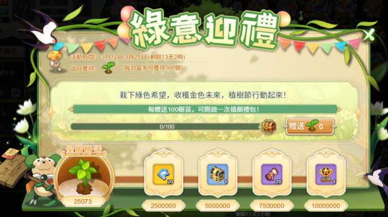 本次植树节活动带来多项节日玩法与丰富奖励,玩家可透过参与活动取得各类游戏资源,并有机会将全新宠物 「千叶神树」 带回家。部分活动玩法包含抽奖机制,相关机率与详细规则请参考游戏内详细説明。